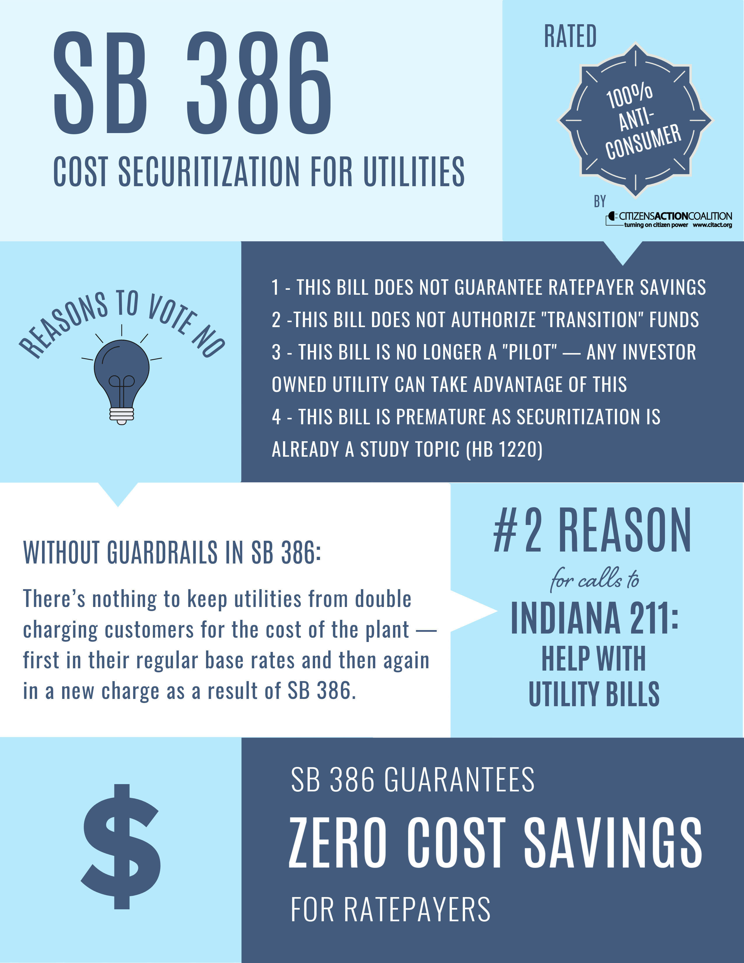 But the worst bill this week—indeed this session—is Senate Bill 386, which was heard in Senate Utilities last Thursday. SB386 is Indiana’s first attempt at securitization, or financing capital recovery with a bond repaid in utility bills. Unfortunately, SB386 gets it dreadfully wrong. Despite being sold as bill which will save customers money, the legislation only promises to increase utility bills by sticking consumers with a surcharge on their monthly bills for the next 15 years, while delivering the utility and their investors a truckload of cash. Nothing in the bill guarantees that consumers will save one single penny. Despite testimony outlining this, the committee quickly passed the bill, 9-2, despite a wealth of concerns from committee members.