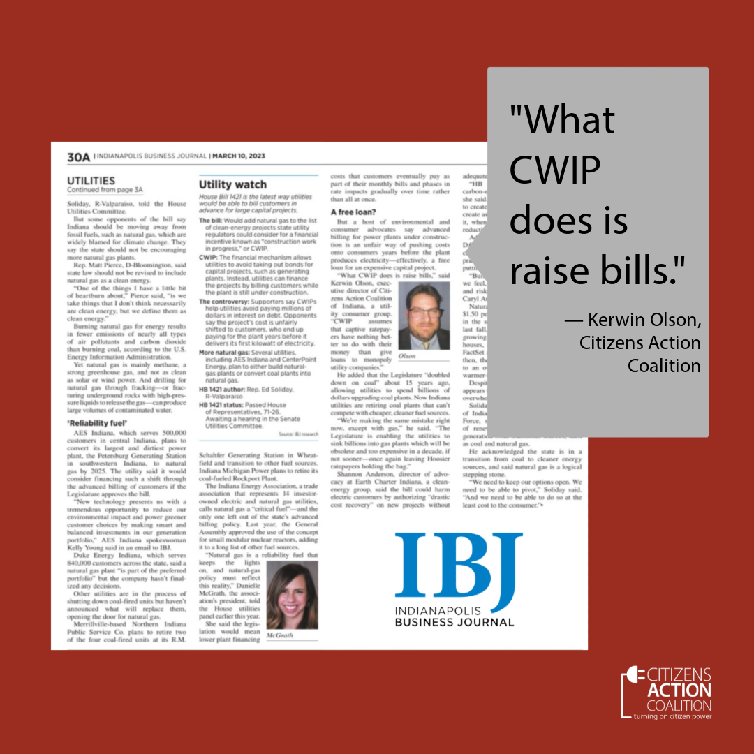 The Senate Utilities Committee passed House Bill 1007, a priority bill for the House Republicans and an attempt at an Energy Policy for the state. We testified on HB1007 from a neutral standpoint. The Committee also passed House Bill 1421, which gives utilities Construction Work in Progress, or CWIP, for the construction of dirty and expensive fossil-gas power plants. CAC was the only opposing testimony on the bill. Our testimony on HB1421, available on YouTube, was detailed in an article by John Russell at the Indianapolis Business Journal.