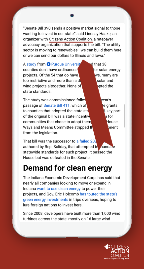 More coverage of legislation impacting Indiana consumers in the Indianapolis Star includes HB1623, which would allow electric utilities to further manipulate loopholes in the existing EPA rule regarding coal combustion residuals (coal ash). Although HB1623 has not been announced for a hearing in the Senate yet, this bill is a dangerous prospect for Hoosiers since we have more coal ash ponds than any other state, and our ponds are leaking toxins that threaten our water supply. The Star article also discussed Senate Bill 33, which deals with solar panel decommissioning. SB33 is awaiting a hearing in the House.