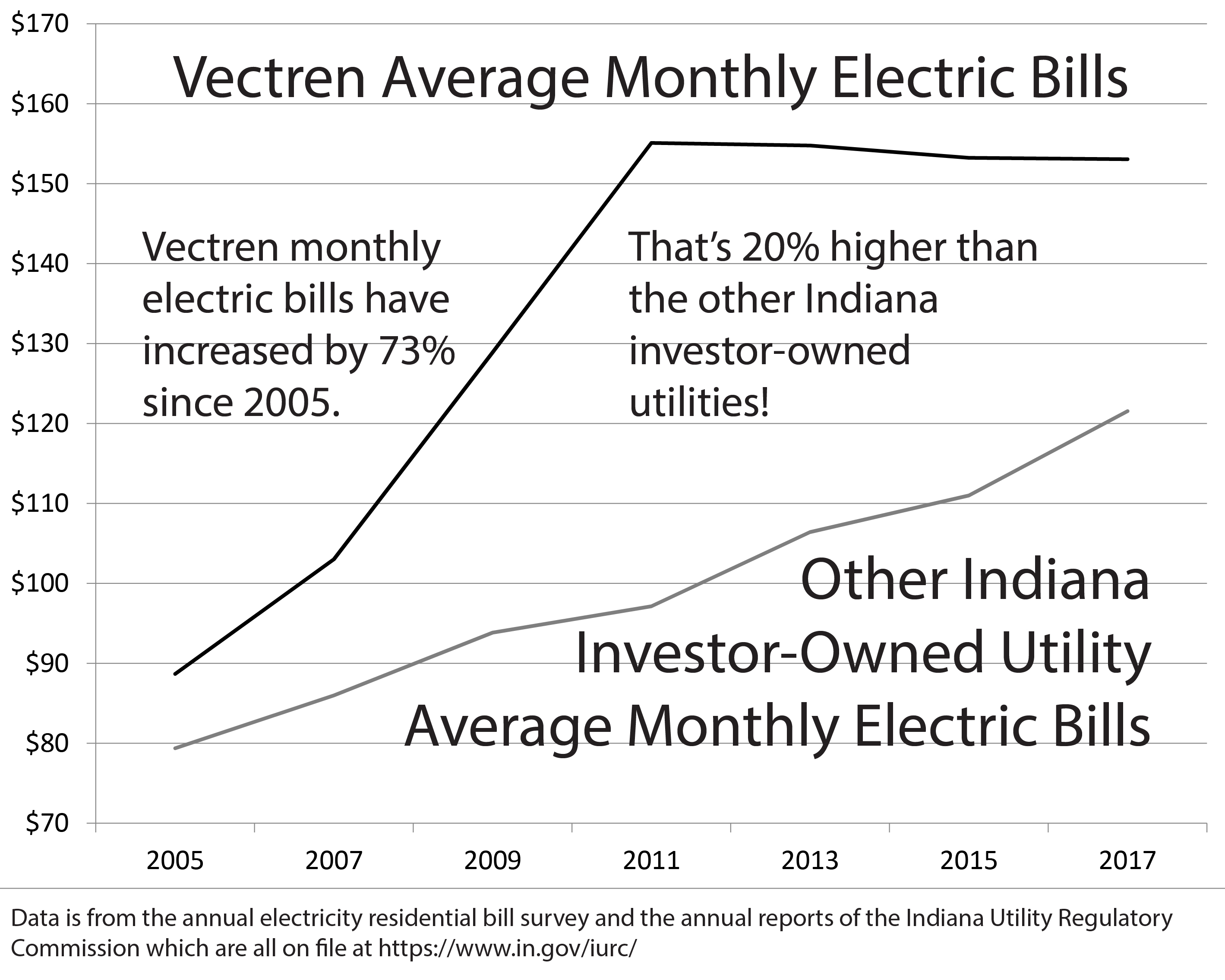 Since 2005 for customers using 1,000kWh per month, Vectren’s average monthly residential electric bill, including taxes, has increased from $88.67[2] to $153.06[3], an alarming 73%.